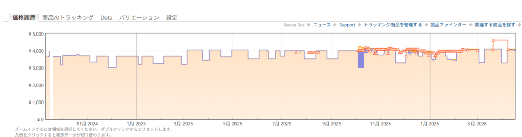 以下は4月17日時点で一番Amazonで売れていた「ザバス(SAVAS) ソイプロテイン100 ココア味」だが、1年前と比べ値下がりしていない時期を比べると、3678円が4080円に上がった程度。